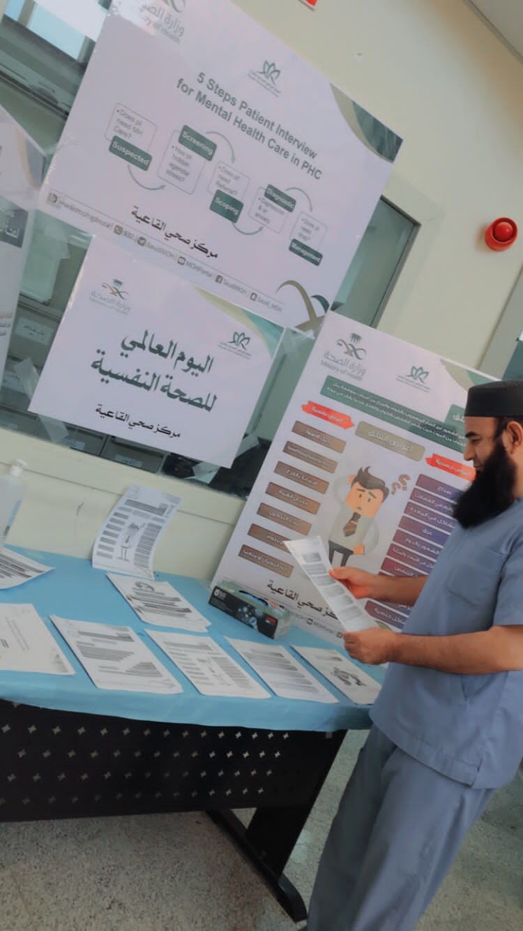 اقام مركز صحي القاعيه فعاليات ( اليوم العالمي للصحه النفسيه ) تحت متابعة و اشراف من مدير مستشفى البجادية أ. تركي العفتان ومساعد مدير المستشفى لصحه المجتمع .