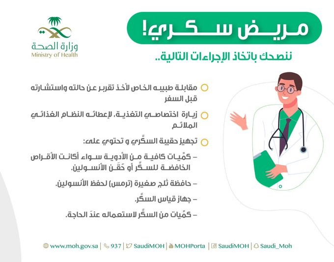 وقالت صحة الرياض، : يجب على مريض السكري مقابله طبيبه الخاص لأخذ تقرير عن حالته الصحية واستشارته قبل السفر، بالإضافة إلى زيارة اختصاصي تغذية لإعطائه النظام الغذائي الملائم.