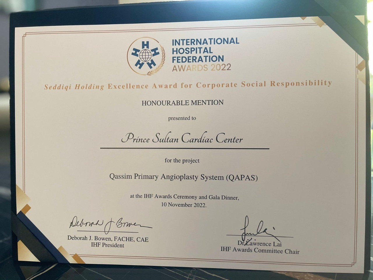حصل تجمع القصيم الصحي ممثلًا بمركز الأمير سلطان لطب وجراحة القلب بالقصيم على جائزة التميز الدولي للمستشفيات، وذلك خلال الدورة الـ 45 لمؤتمر الاتحاد العالمي للمستشفيات، الذي أقيم في إمارة دبي بدولة الإمارات العربية المتحدة، بمشاركة ومنافسة 400 مستشفى ومركز طبي من أكثر من 35 دولة من مختلف أنحاء العالم ، وعقد تحت شعار "تحقيق الاستدامة ومستقبل قطاع المستشفيات في 2030".