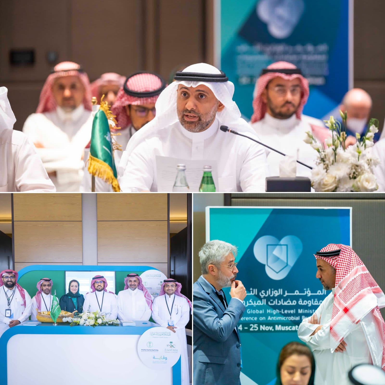 شارك مختصون من قطاع الصحة الحيوانية بالمركز الوطني للوقاية من الآفات النباتية والامراض الحيوانية ومكافحتها ضمن وفد المملكة المشارك في المؤتمر الوزاري الثالث رفيع المستوى للميكروبات المقاومة للمضادات برئاسة معالي وزير الصحة الدكتور فهد الجلاجل والذي عّقد في مدينة مسقط بسلطنة عمان في الفترة من 24-25/11/2022م، والذي نظمته السلطنة بمشاركة ما يقارب خمسين دولة، والمجموعة الرباعية المشكلة من الأمم المتحدة لمتابعة مقاومة المضادات الميكروبية (منظمة الصحة العالمية، المنظمة العالمية لصحة الحيوان، برنامج الأمم المتحدة لصحة البيئة ، منظمة الأمم المتحدة للأغذية والزراعة)، ومجلس الصحة لدول مجلس التعاون لدول الخليج العربية.
