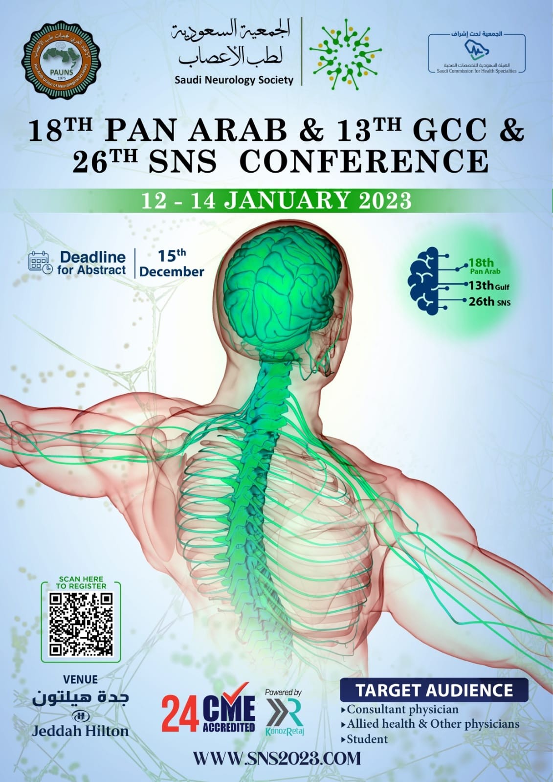 تقييم الجمعية السعودية لطب الأعصاب المؤتمر الثامن عشر للاتحاد العربي والثالث عشر الخليجي والسادس والعشرون السعودي لطب الأعصاب خلال الفترة من 12-14 يناير 2023 م في فندق الهيلتون بمدينة جدة حيث يشارك بالمؤتمر متحدثون من المملكه ومن بعض الدول العربية والدول الاجنبيه ، كما ويشارك بالمؤتمر العديد من الجمعيات العالمية والإقليمية والمحلية مثل: الاتحاد العالمي لطب الأعصاب بوجود رئيس الاتحاد العالمي، والجمعية الأمريكية لطب الأعصاب بوجود رئيس الجمعية ، والجمعية البريطانية لطب الأعصاب بوجود رئيس الجمعية ، والجمعية الاسيوية لطب الأعصاب بوجود رئيس الجمعية ، والجمعية الأفريقية لطب الأعصاب بوجود رئيس الجمعية ، والاتحاد العربي لطب الأعصاب بوجود رئيس الاتحاد العربي ، والاتحاد الخليجي لطب الأعصاب بجميع أعضاءه ورؤساء الجمعيات لطب الأعصاب في الوطن العربي وجمعية الصرع السعودية وجمعية الجلطة السعودية بالإضافة إلى عدد كبير من الممارسين الصحيين من داخل المملكة العربية السعودية وخارجها، كما سيقام على هامش المؤتمر ورش عمل مخصصة لأحدث التقنيات في مجال طب الأعصاب.