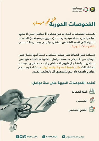 أكّد مجلس الصحة لدول مجلس التعاون الخليجي، على أهمية إجراء الفحوصات الدورية لتجنب بعض الأمراض التي لا تظهر أعراضها في مرحلة مبكرة، وذلك عبر مجموعة من الخدمات التي تقدم للشخص بشكل روتيني.