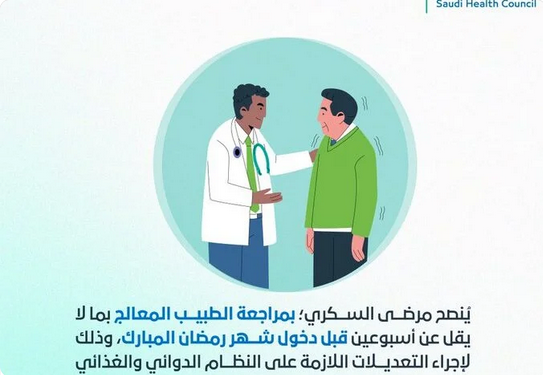 وقال المجلس إنه ينصح مرضى السكري، بمراجعة الطبيب المعالج بما لا يقل عن أسبوعين قبل دخول شهر رمضان المبارك، وذلك لإجراء التعديلات اللازمة على النظام الدوائي والغذائي أثناء الصيام.