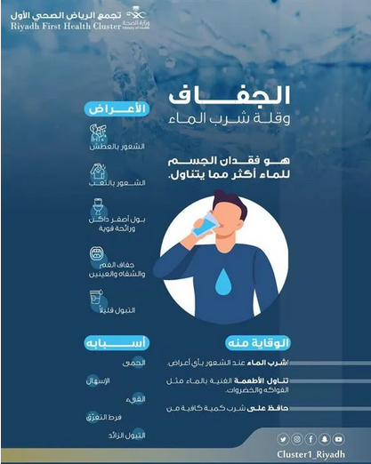 وأوضحت الوزارة، أن الجفاف عبارة عن فقدان الجسم للماء أكثر مما يتناول، وتشمل أعراضه الشعور بالعطش والشعور بالتعب والبول الأصفر الداكن، إلى جانب جفاف الفم والشفتين والعينين، والتبول قليلاً.
