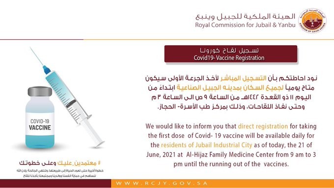أعلنت إدارة الخدمات الطبية بالهيئة الملكية بالجبيل عن إتاحة الجرعة الأولى من اللقاح ضد فايروس كورونا المستجد لجميع المواطنين والمقيمين بمدينة الجبيل الصناعية والمؤهلين لأخذ اللقاح عبر التسجيل المباشر وذلك بعيادة طب الأسرة والمجتمع ب (محلة الحجاز) بدءا من الساعة التاسعة صباحا وحتى الثالثة عصرا حتى نفاذ الكمية، وذلك دون حجز مسبق عبر برنامج ( توكلنا ) وفقا لما كان معمول به منذ بداية حملة التطعيم ضد المرض مما سهل علي الكثيرين الحصول عليها.