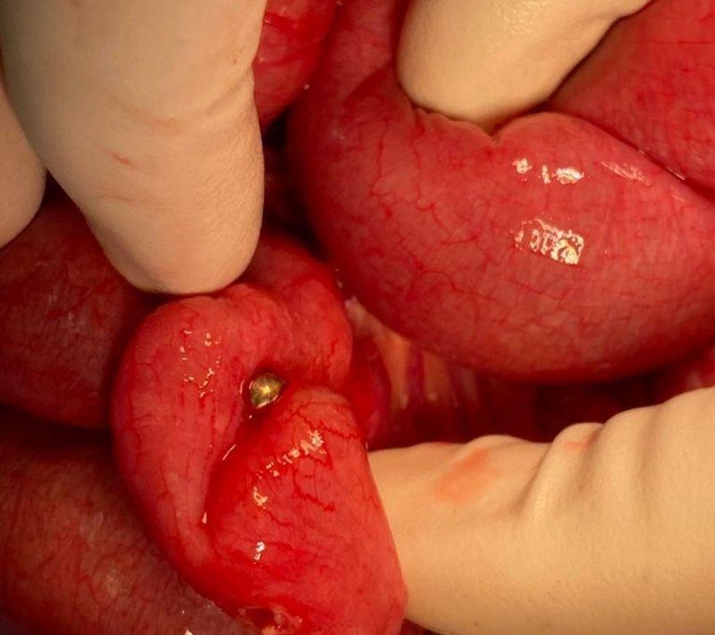 فيما أبان الدكتور "تركي رشاد" أنه من خلال الفحص تَبَيّن أيضًا وجود علامات التهاب وانتفاخ في الأمعاء، نتج عنه الاستفراغ المستمر لدى الطفل؛ مما أدى إلى إجراء عملية عاجلة للمريض والتأكد من وجود خمس ثقوب في الأمعاء.