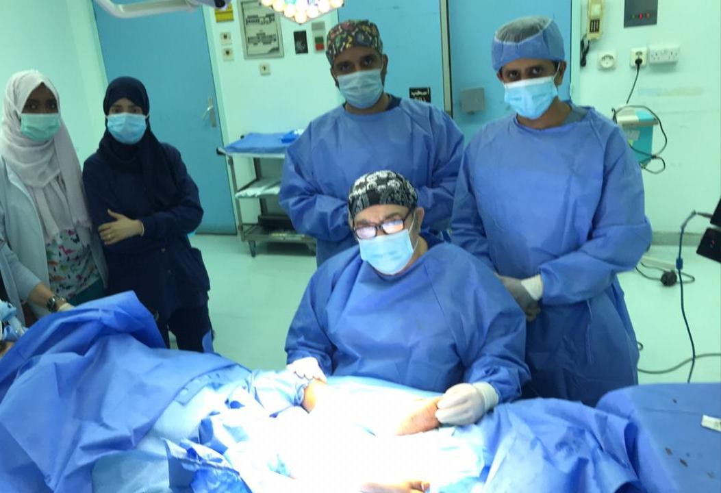 حيث قام الفريق الطبي بعملية تكميلية دقيقة، تم من خلالها بناء و إنقاذ للقدم المصابة بنقل شريحة أنسجة من القدم اليمنى السليمة مع استخدام أسياخ لتثبيت الرجلين معاً بشكل مؤقت، و استغرقت العملية ٥ ساعات تكللت بالنجاح بحمدالله.