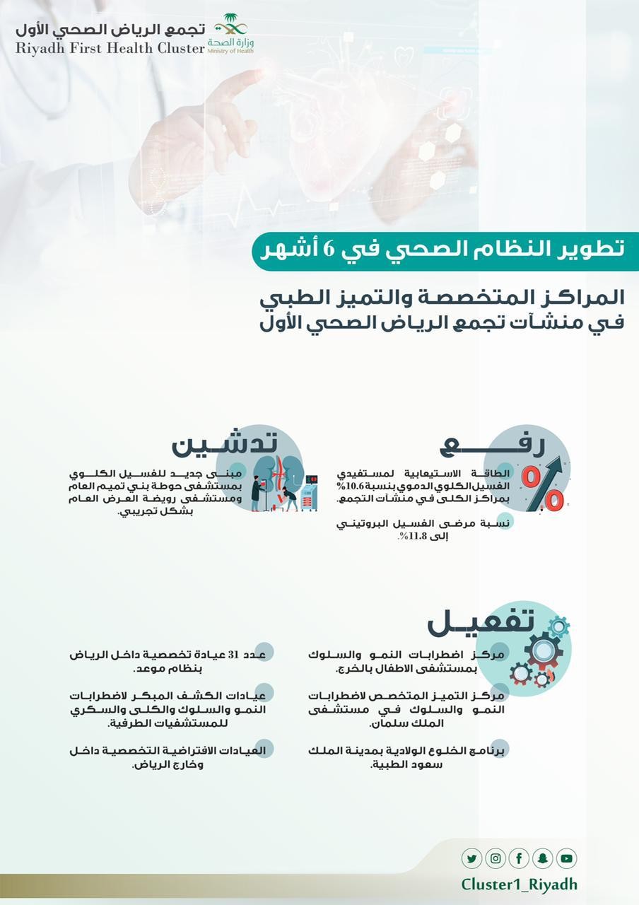وأوضح مدير إدارة المراكز المتخصصة والتميز الطبي بتجمع الرياض الصحي الأول الأخصائي صالح الغانم عن أهم إنجازات المراكز المتخصصة والتميز الطبي في الإدارة التنفيذية لتطوير النظام الصحي خلال الستة أشهر الماضية من العام 2021، حيث تم رفع نسبة مرضى الغسيل البروتيني إلى 11.8%، كما تم رفع الطاقة الإستيعابية لمستفيدي الغسيل الكلوي الدموي بنسبة 10.6% في مراكز الكلى بمنشآت "التجمع الأول".