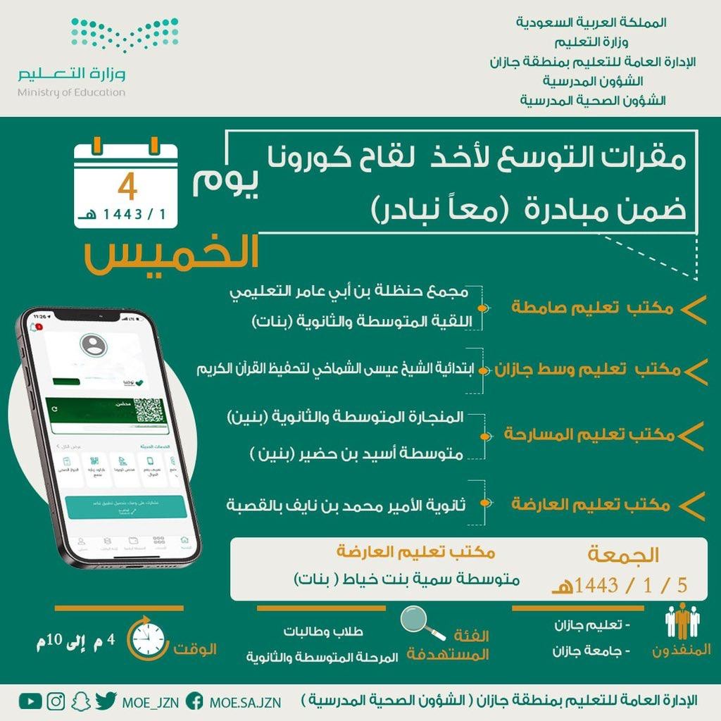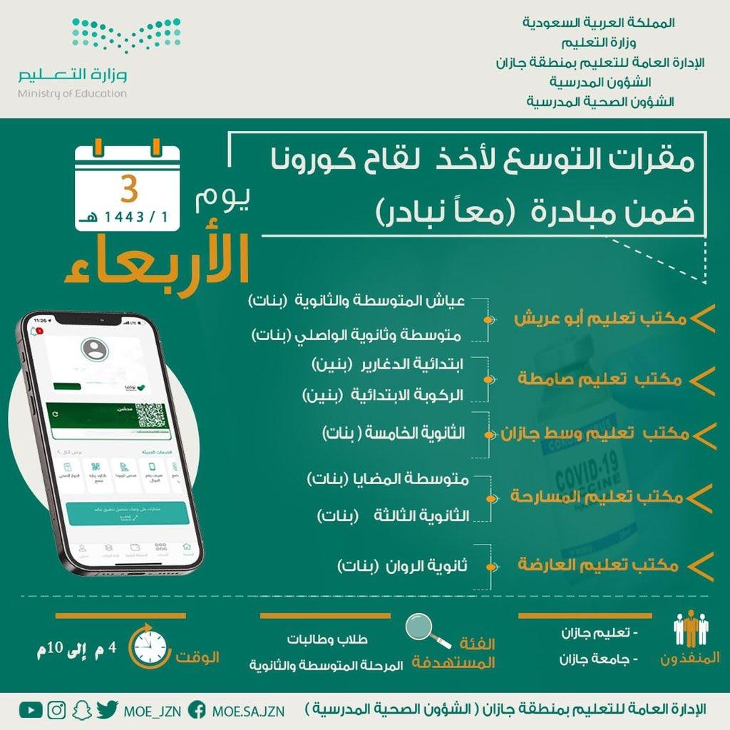 فقد اعتمد تعليم جازان فتح مقرات جديدة لأخذ اللقاحات للطلاب والطالبات على مدى الايام الثلاثة القادمة .