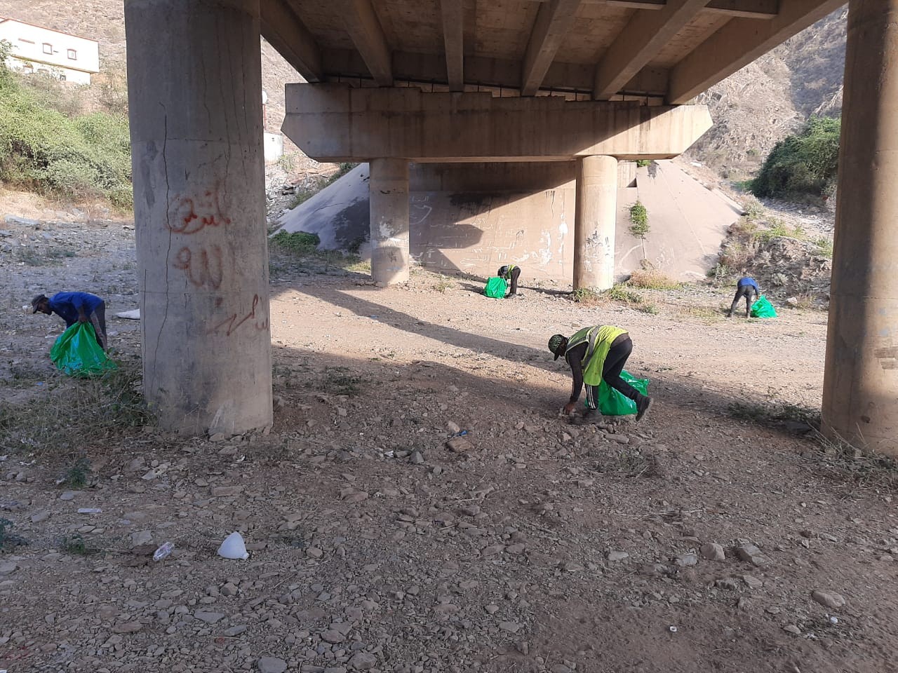 بلدية رجال ألمع تزيل النفايات من مجاري الأودية وأسفل الكباري بالمحافظة
