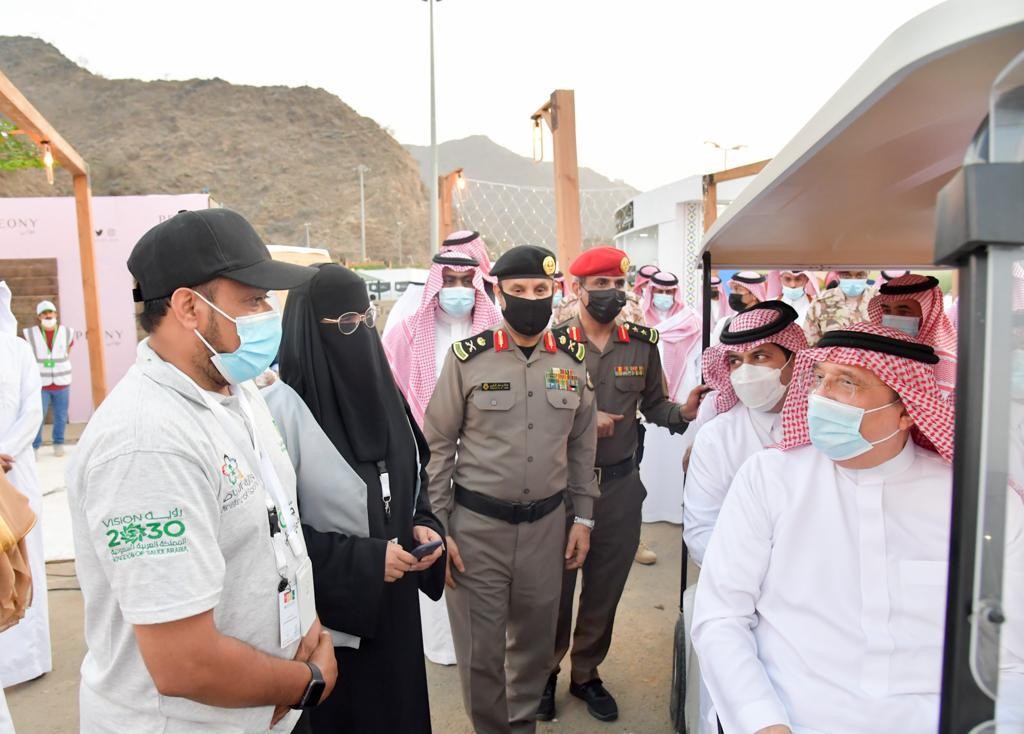 واستمع سمو أمير منطقة جازان لشرح من قبل رئيس الفريق عبدالله بن إبراهيم عكور ومشرفة مشاة الداير الأستاذة خيرية الفيفي عما يعرضه فريق مشاة جازان في الركن من اللوحات التعريفية بالمشي والأكل الصحي والمجسمات التي توضح فوائد المشي ونشر ثقافته والتعريف بالفريق والأنشطة والبرامج التي نفذها على مستوى منطقة جازان واستلم سموه تيشرت الفريق ونوه سمو بجودة وأهمية رياضة المشي للصحة العامة.