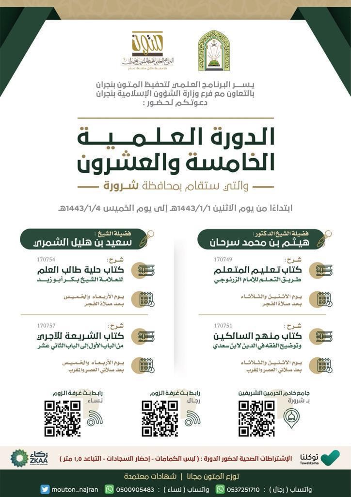 اختتم فرع وزارة الشؤون الإسلامية والدعوة والإرشاد الدورة العلمية الخامسة والعشرين بمحافظة شرورة بحضور سعادة المحافظ الأستاذ موفق بن عبدالهادي العنزي وفضيلة مدير فرع وزارة الشؤون الإسلامية بنجران د عبدالرحمن بن سعد العصيمي، والتي نفذها البرنامج العلمي لتحفيظ المتون ( متون ) بإشراف إدارة الدعوة بالفرع، وذلك بجامع خادم الحرمين الشريفين بالمحافظة للفترة ١ - ٤ / ١ / ١٤٤٣هـ