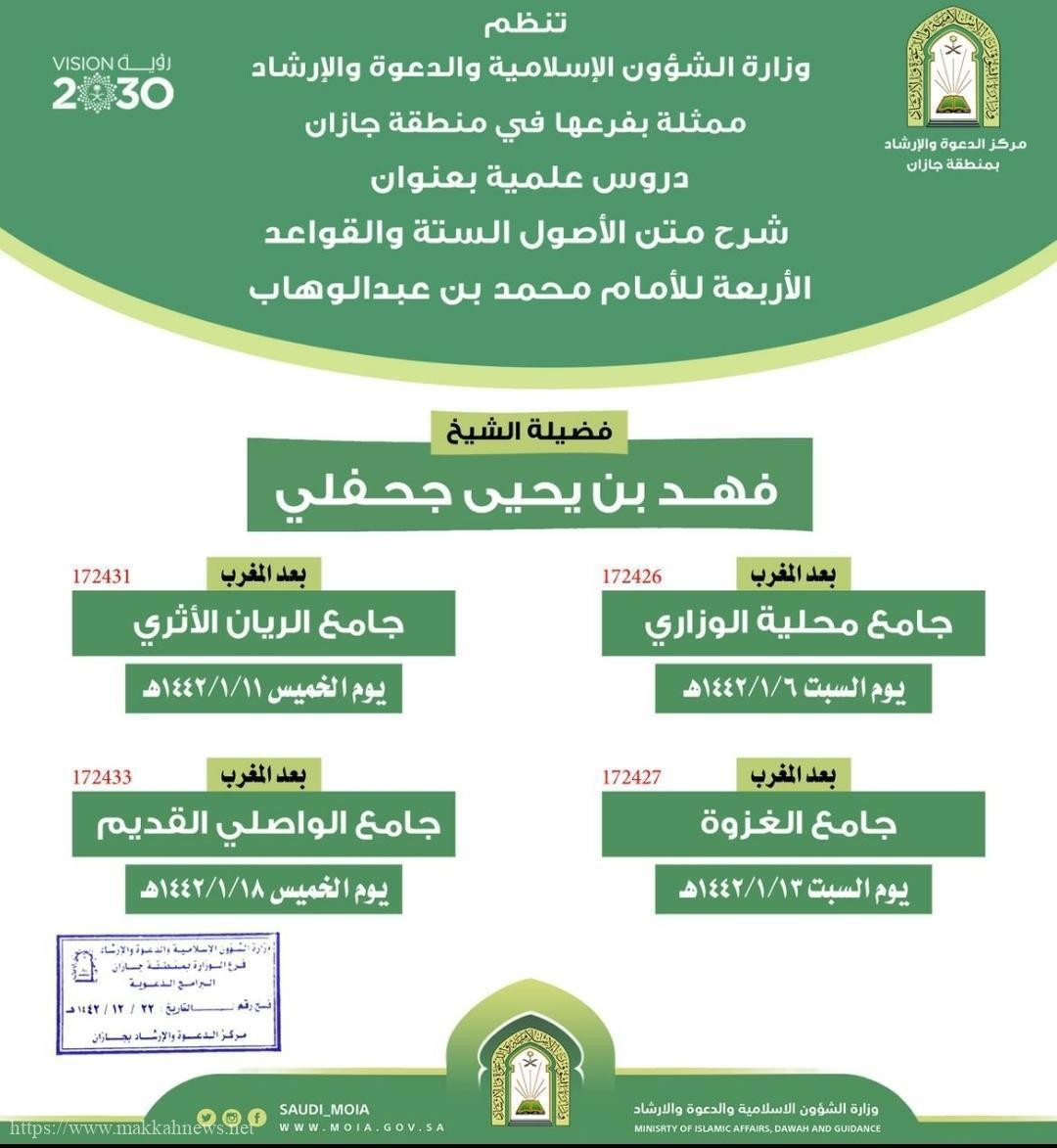 جازان : تنظم وزارة الشؤون الإسلامية والدعوة والإرشاد ممثلة بفرعها في منطقة جازان دروس علمية بعنوان ” شرح متن الأصول الستة والقواعد الأربعة للامام محمد بن عبدالوهاب ” هذا وبدأ تنفيذ الدروس مساء السبت السادس من محرم لعام 1442 للهجرة في جامع محليه الوزاري ، وفي يوم الخميس الحادي عشر من نفس الشهر تُنفّذ بجامع الريان الأثري ، وفي يوم السبت الثالث عشر من نفس الشهر أيضاً تُقام بجامع الغزوة ، وختاماً في يوم الخميس الثامن عشر تُقام أيضاً بجامع الواصلي القديم ، علماً بأن جميع الدروس العلمية يقدمها فضيلة الشيخ فهد بن يحيى جحفلي .