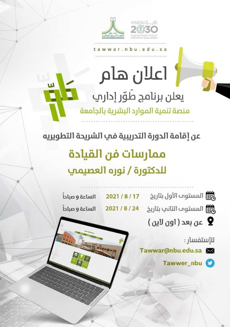يقيم برنامج طور إداري بجامعة الحدود الشمالية دورة ممارسات فن القيادة للدكتورة نورة العصيمي ، وكم يأتي المستوى الأول بتاريخ 2021/8/17