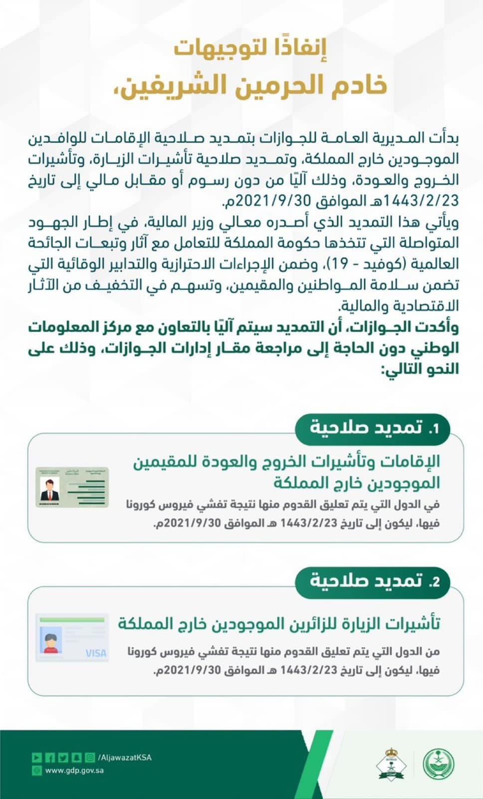 إنفاذًا لتوجيهات خادم الحرمين الشريفين الملك سلمان بن عبدالعزيز آل سعود - حفظه الله - بدأت المديرية العامة للجوازات تمديد صلاحية الإقامات للوافدين الموجودين خارج المملكة، وتمديد صلاحية تأشيرات الزيارة، وتأشيرات الخروج والعودة، وذلك آليًا من دون رسوم أو مقابل مالي إلى تاريخ 23 / 2 / 1443هـ، الموافق 30 / 9 / 2021م.