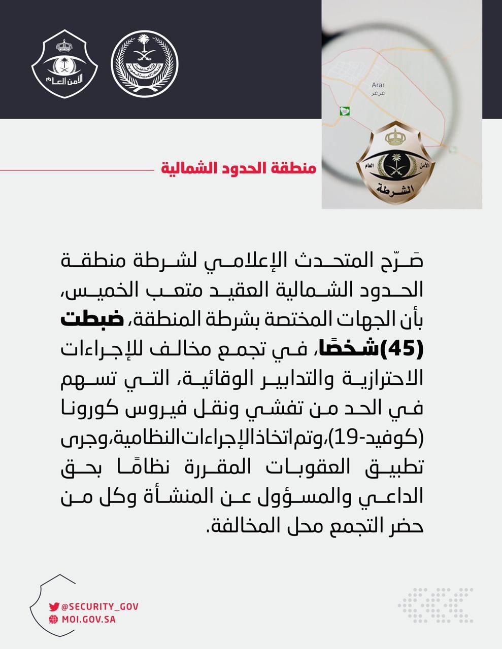 صَرّح المتحدث الإعلامي لشرطة منطقة الحدود الشمالية العقيد متعب الخميس، بأن الجهات المختصة بشرطة المنطقة، ضبطت (45) شخصًا، في تجمع مخالف للإجراءات الاحترازية والتدابير الوقائية التي تسهم في الحد من تفشي ونقل فيروس كورونا (كوفيد - 19)، وتم اتخاذ الإجراءات النظامية، وجرى تطبيق العقوبات المقررة نظامًا بحق الداعي والمسؤول عن المنشأة وكل من حضر التجمع محل المخالفة.
