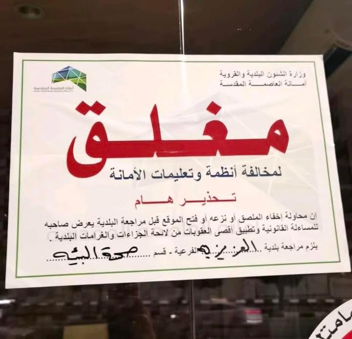 أغلقت أمانة العاصمة المقدسة ممثلةً في بلدية العزيزية الفرعية 5 منشآت تجارية مخالفة للاشتراطات البلدية وذلك خلال جولاتها الرقابية على المنشآت التجارية؛ للتأكد من الالتزام بتطبيق الاشتراطات الصحية والإجراءات الاحترازية اللازمة.