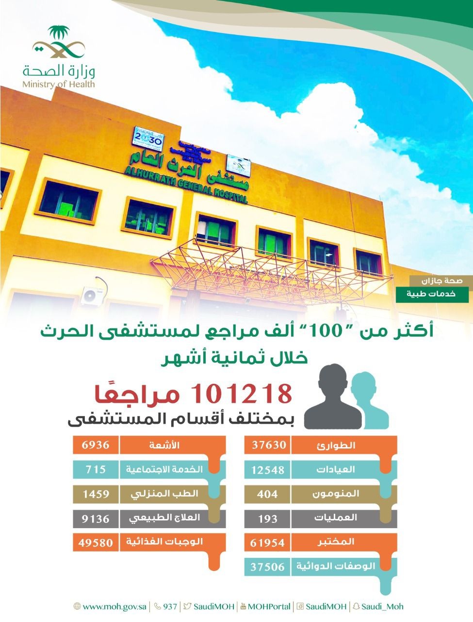 قدم مستشفى الحرث العام بمنطقة جازان خدماته خلال ثمانية أشهر من العام الحالي لعام 2021م لعدد 101218 مراجعا بمختلف أقسام المستشفى.