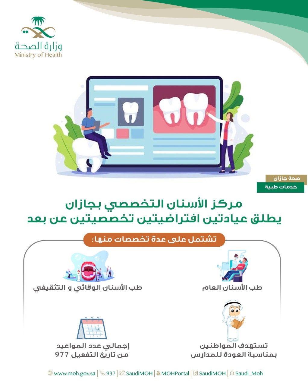 أطلق مركز الأسنان التخصصي بجازان عيادتين تخصصية افتراضية عن بعد للمرضى والمراجعين في منطقة جازان وذلك تزامنًا مع عودة الطلاب والطالبات للمدارس .