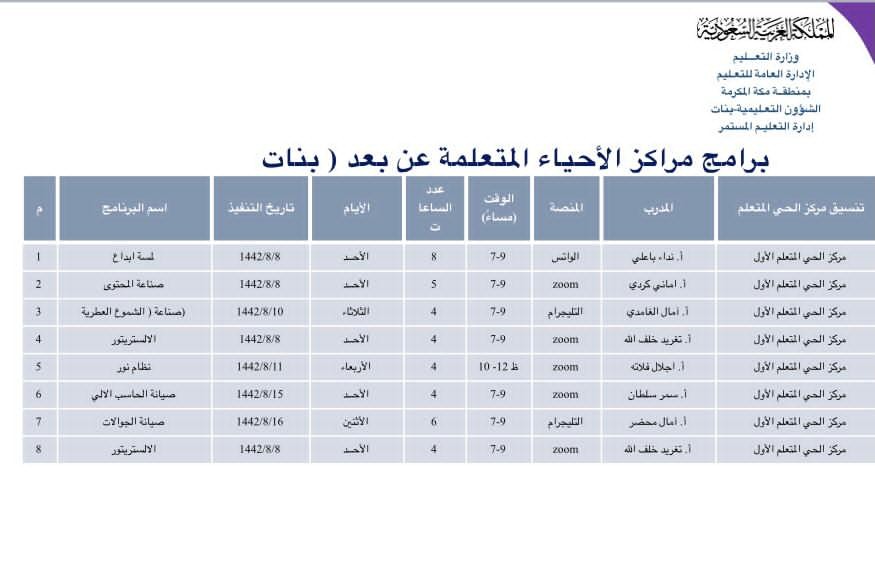 إدارة التعليم المستمر بتعليم مكة تطلق جدول برامج مركز الأحياء المتعلمة لعام1442هـ
