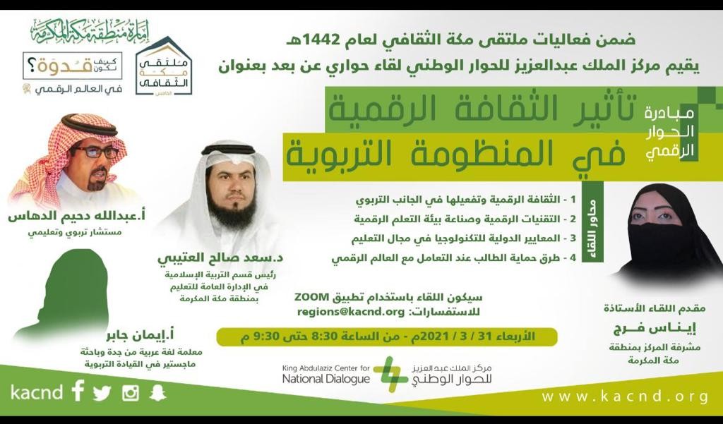 يُقدم مركز الملك عبد العزيز للحوار الوطني في منطقة مكة المكرمة اللقاء الحواري السادس عن بعد (تأثير الثقافة الرقمية في المنظومة التربوية) اليوم الأربعاء الموافق ١٤٤٢/٨/١٨هـ عبر منصة الحوار الوطني زووم من الساعة ٨ ونص إلى ٩ ونص مساء وذلك ضمن مبادرة المركز (الحوار الرقمي) التي يشارك بها المركز في ملتقى مكة الثقافي الخامس (كيف نكون قدوة في العالم الرقمي ؟) وذلك بمشاركة الدكتور سعد العتيبي رئيس قسم التربية الإسلامية في الإدارة العامة للتعليم في منطقة مكة المكرمة والمستشار التربوي والتعليمي الأستاذ عبد الله الدهاس وإيمان جابر معلمة لغة عربية من جدة وباحثة ماجستير في القيادة التربوية ، هذا وتدير اللقاء مشرفة المركز في منطقة مكة المكرمة الأستاذة إيناس فرج .