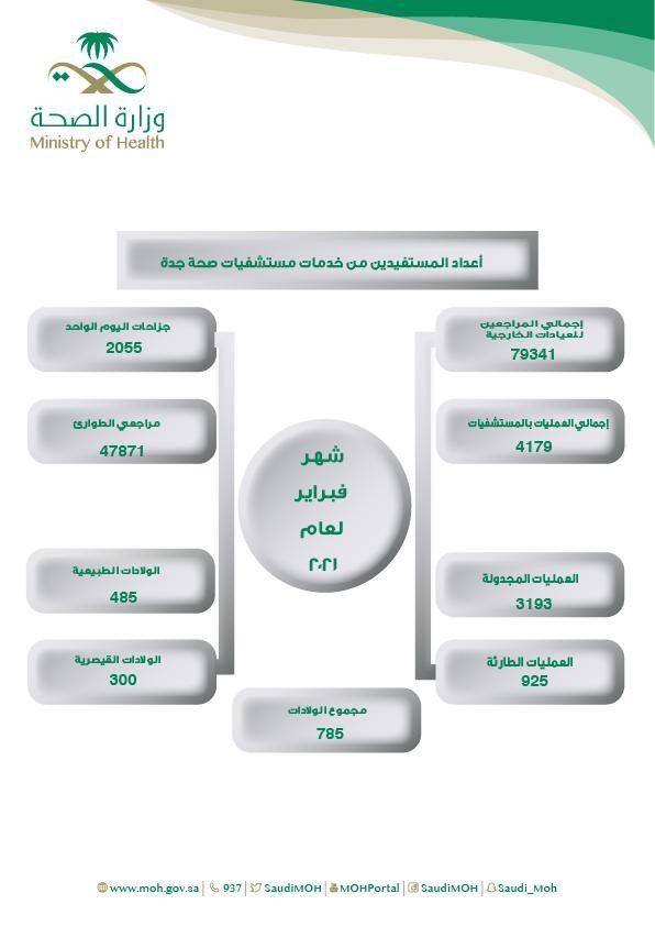 كما بلغ عدد العمليات الطارئة 925 عملية، والعمليات المجدولة بلغت 3,193 عملية، و جراحات اليوم الواحد بلغت 2,055 جراحة، وبخصوص خدمات الولادة بيّنت صحة جدة أن مجموع الولادات بلغ 785 ولادة، بلغ عدد الولادات الطبيعية 485 ولادة، والقيصرية بلغت 300 ولادة قيصرية