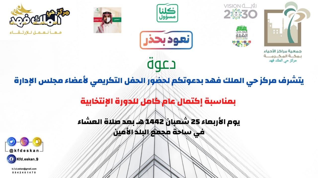 يقيم مركز حي الملك فهد والتابع لجمعية مراكز الأحياء بمكة المكرمة مساء يوم الأربعاء القادم الخامس والعشرين من شهر شعبان ١٤٤٢هـ الحفل التكريمي لأعضاء مجلس إدارة المركز وذلك بمناسبة اكتمال عام كامل للدورة الإنتخابية، أوضح ذلك الدكتور أحمد بن عبدالوهاب دهان نائب رئيس مجلس إدارة المركز ، وأشار بأن الحفل سيقام عقب صلاة العشاء في ساحة مجمع البلد الأمين.