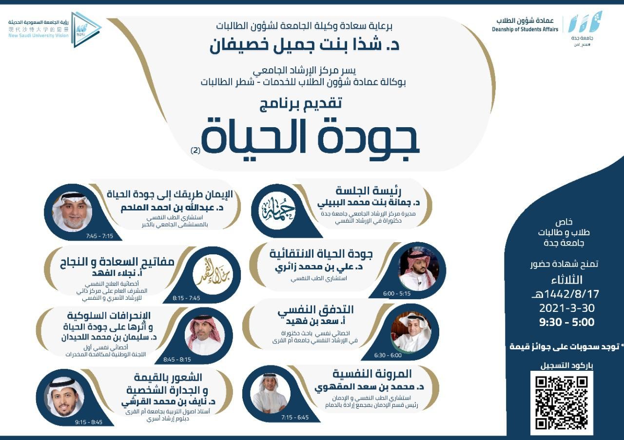 برعاية وكيلة الجامعة لشؤون الطالبات الدكتورة شذا بنت جميل خصيفان نظمت جامعة جدة متمثلة بمركز الإرشاد الجامعي برنامج جودة الحياة بنسخته الثانية بإشراف وكيلة عمادة شؤون الطلاب للخدمات أ.د. سوزان بنت عبد الرحمن خياط وذلك يوم الثلاثاء الموافق ١٧  شعبان تمام الساعة الخامسة مساءً إلى التاسعة والنصف، والذي رحبت فيه بالحضور ووضحت هدف البرنامج الذي يسعى لتحقيق جودة الحياة للمواطن السعودي انطلاقا من رؤية المملكة ٢٠٣٠.