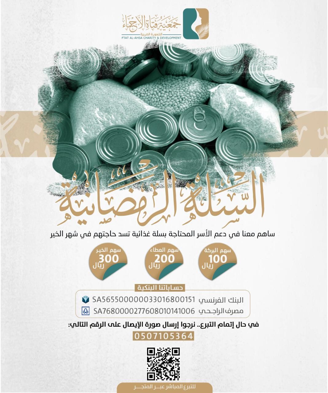تقيم جمعية فتاة الأحساء التنموية الخيرية مشروع "السلة الرمضانية" تحت شعار "أطعموا الطعام وأفشوا السلام"، والذي يستهدف 1000 أسرة من الأسر التي ترعاها الجمعية، من أرامل ومطلقات وأيتام وأسر السجناء داخل نطاق الجمعية الجغرافي ..