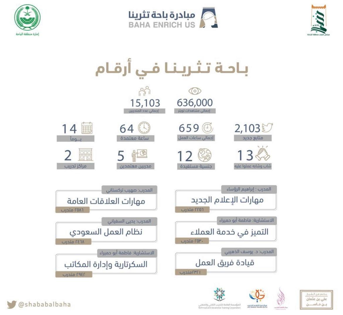 اختتمت امارة منطقة الباحة ممثلة في مجلس شباب المنطقة ، البرنامج التدريبي" باحة تثرينا " أحد مسارات حملة "أنت المسؤل الأول" التي حظيت برعاية كريمة من صاحب السمو الملكي الأمير الدكتور حسام بن سعود بن عبدالعزيز أمير منطقة الباحة ، حيث استمر البرنامج لمدة 14 يوماً من الإثراء المعرفي والفكري والذهني مضمناً 6 دورات تدريبية تفاعلية اثرائية افتراضية نُفذت بالشراكة مع مركز الزاهرة ومركز جيل التقدم وباعتماد من مركز التدريب التقني والمهني ودعم سخي من رجل الأعمال علي بن حاسن ، قدمها خمسة مدربين من روّاد المعرفة وذوي الخبرات في العديد من المجالات تمثلت في (مهارات الاعلام الجديد ، ومهارات العلاقات العامة ، وخدمات العملاء ، ونظام العمل السعودي الجديد ، وقيادة فرق العمل ، والسكرتارية الحديثة وادارة المكاتب) ، فيما بلغ عدد المستفيدين منها 15103 مستفيد من داخل المملكة وعدد من الجنسيات الأجنبية وذلك على منصة المجلس عبر برنامج ZOOM .