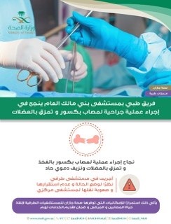 ذكرت صحة جازان بأن فريق طبي بمستشفى بني مالك العام نجح في إجراء عملية لمصاب بكسور بالفخذ وتمزق بالعضلات ونزيف دموي حاد.