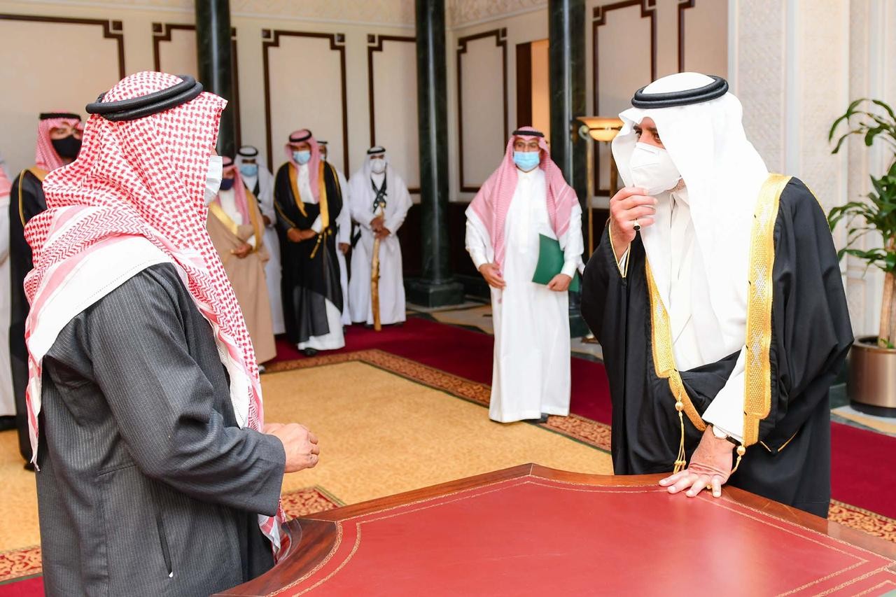 أمير منطقة تبوك يستقبل أحد الحرفيين بالمنطقة والذي يعمل في حياكة الأقمشة
