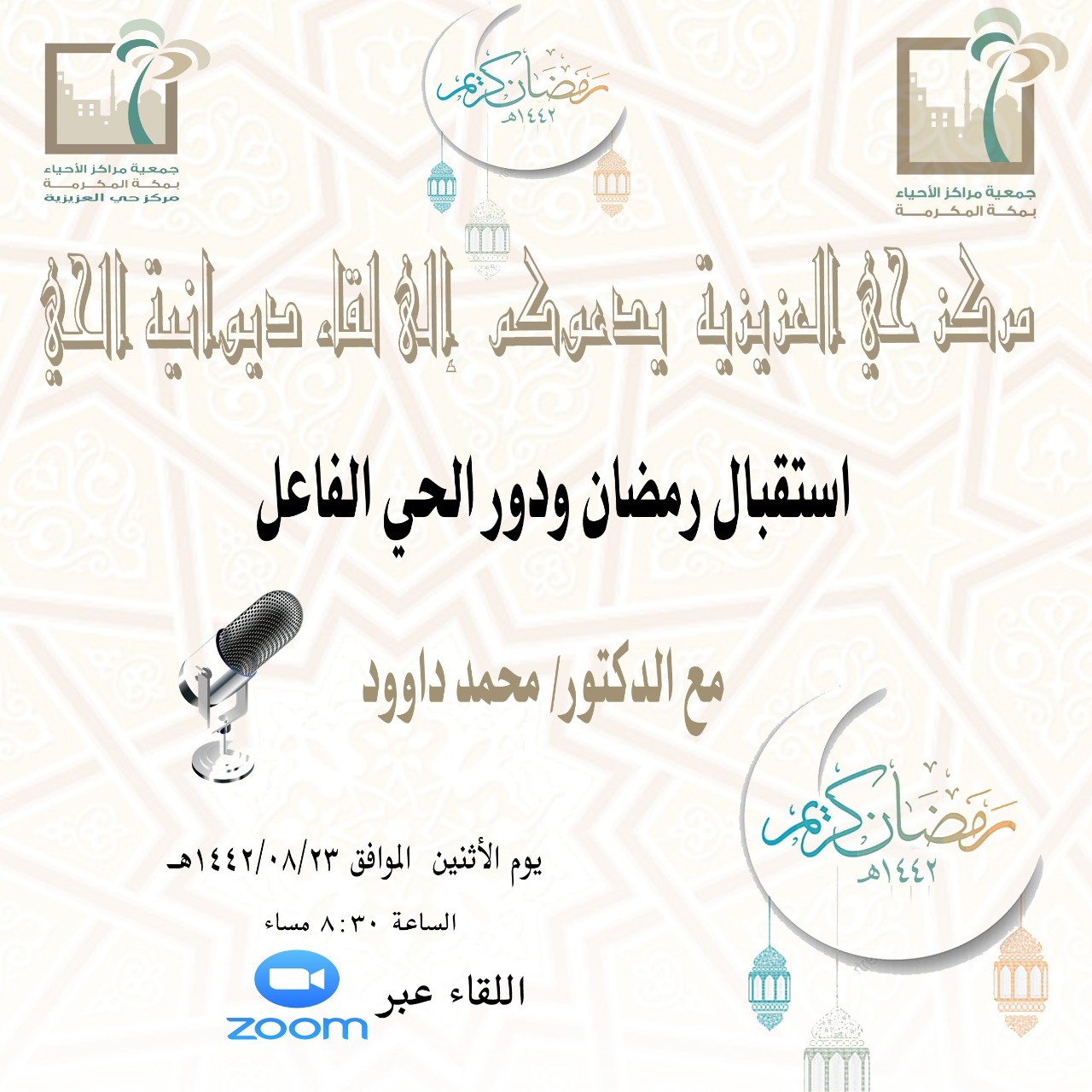 أقام مركز حي العزيزية لقاء ديوانية الحي بعنوان "استقبال رمضان ودور الحي الفاعل" عن بعد عبر برنامج الزوم، قدمه الدكتور محمد بن حسن داوود والذي حث من خلاله الجميع على أهمية استقبال شهر رمضان والاستعداد له؛ ومن ذلك فعل الخيرات ومساعدة الآخرين وتلمس احتياجات الجيران وبذل الصدقات في هذا الشهر المبارك .
