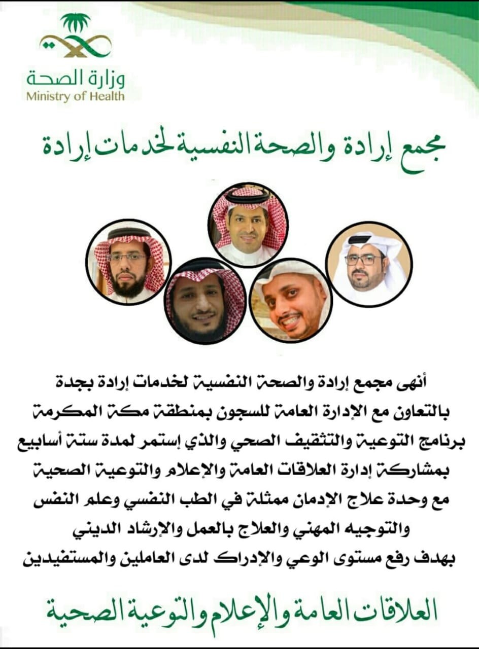 اختتم مجمع إرادة والصحة النفسية لخدمات إرادة بجدة بالتعاون مع الإدارة العامة للسجون بمنطقة مكة المكرمة برنامج التوعية والتثقيف الصحي والذي استمر لمدة ستة أسابيع بمشاركة إدارة العلاقات العامة والإعلام والتوعية الصحية بمجمع إراده مع وحدة علاج الإدمان ممثلة في الطب النفسي وعلم النفس والتوجيه المهني والعلاج بالعمل والإرشاد الديني بهدف رفع مستوى الوعي والإدراك لدى العاملين والمستفيدين في آلية وكيفية التعامل مع المستفيدين.