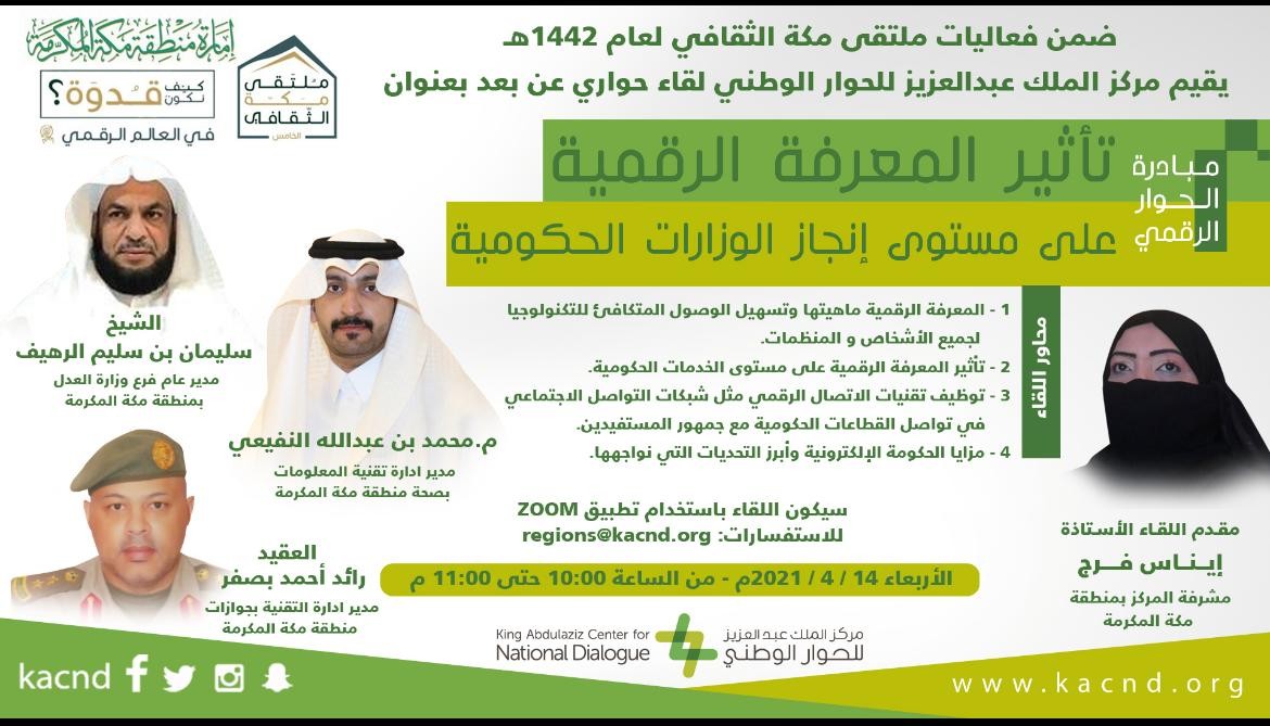 (تأثير المعرفة الرقمية على مستوى إنجاز الوزارات الحكومية )وذلم ضمن مبادرة المركز ( الحوار الرقمي)، في يوم الأربعاء /٢/ رمضان /١٤٤٢هـ والتي يشارك بها المركز في ملتقى مكة الثقافي الخامس (كيف نكون قدوة في العالم الرقمي ) عبر منصة الحوار الوطني زووم الساعة ١٠ مساء إلى ١١ مساء.