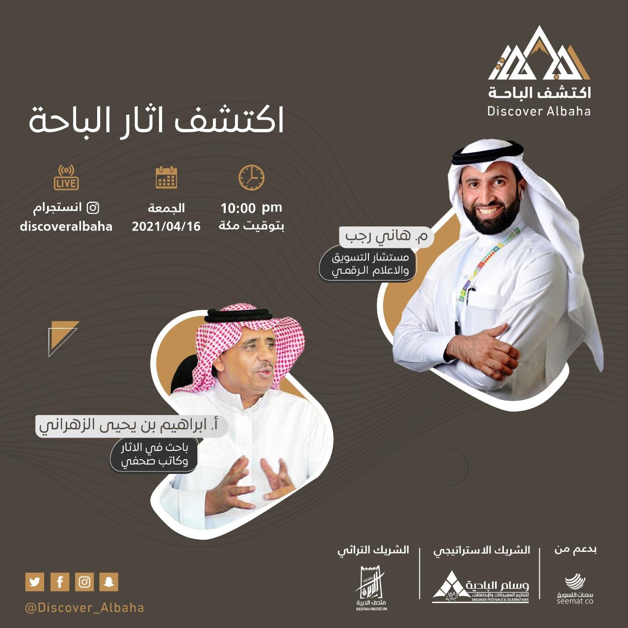 استضاف المهندس هاني رجب المشرف العام على منصة ( اكتشف الباحة ) للتسويق السياحي والثقافي مساء الجمعة الباحث والكاتب الإعلامي إبراهيم بن يحيى الزهراني الذي اثرى اللقاء، بحديثه عن منطقة الباحة من الناحية التاريخية وما تكتنفه المنطقة من آثار تعود الى إنسان ما قبل التاريخ وما تم اكتشافه من نقوش ورسوم تعود للإنسان البدائي وتمتد الى العصر الثمودي والعصر الحديدي وكذلك النقوش التي كتبت بالخط الكوفي، ثم تناول الضيف الاودية والمواقع وما شهدته من أحداث تاريخية مستشهداً بما دونه التاريخ والادب العربي القديم، واستعرض الضيف علاقة آثار منطقة الباحة بحضارات حوض البحر الابيض المتوسط من خلال الفينيقيين والمعينيين التي جسدتها رسوم عالمية، كما استعرض الثراء الثقافي في المنطقة من حيث الثقافة الزراعية وتاريخ المدرجات الزراعية من خلال دراسة ميدانية والامم التي تعاقبت على تلك المدرجات التاريخية ثم تحدث عن منبر دوس وهو منبر العرب قديماً في وادي ثروق وطرق تعلم الوفود للنجوم الزراعية واستخدام المزاول الفلكية والسجال والتحدي في السجع والشعر قديماً كما تناول الباحث الجوانب التهامية واستعرض الاودية التاريخية ومناجم التعدين القديمة وغير ذلك من خلال المعثورات الاثرية.