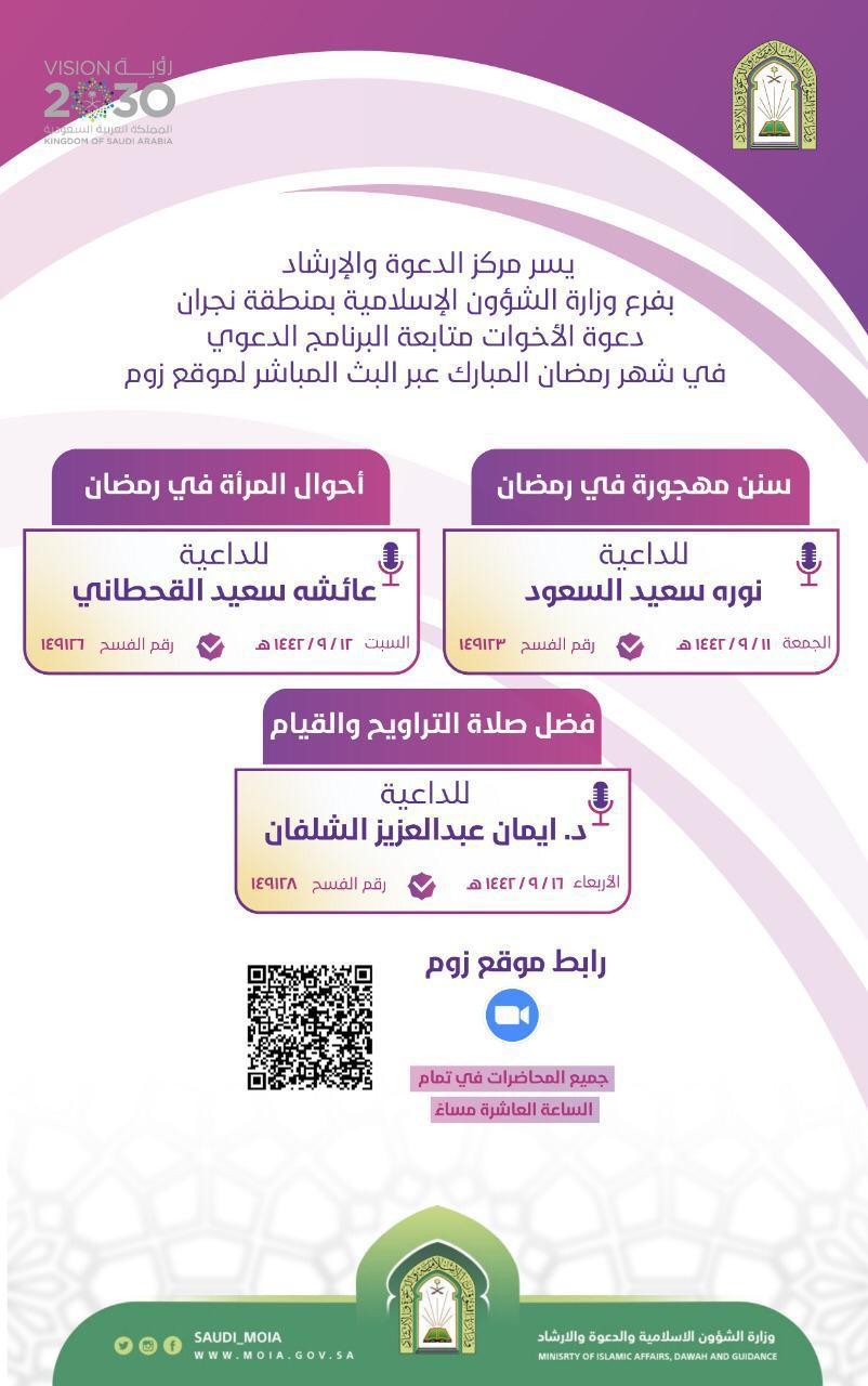 وقد أوضح فضيلة مدير عام فرع الوزارة بنجران الشيخ الدكتور عبدالرحمن بن سعد العصيمي أن المحاضرات ستقام "عن بعد" بواسطة برنامج البث المرئي "zoom”  في تمام الساعة العاشرة مساءً كل ليلة حسب المواعيد المحددة، وذلك ضمن البرنامج النسائي الذي ينظمه الفرع بمنطقة نجران لتعزيز دور المرأة من خلال مشاركة الداعيات المؤهلات بواجب الدعوة إلى الله، ونشر العلم النافع بين أوساط النساء؛ لتبصيرهن بأمور الدين، وما ينفع الأسرة المسلمة.