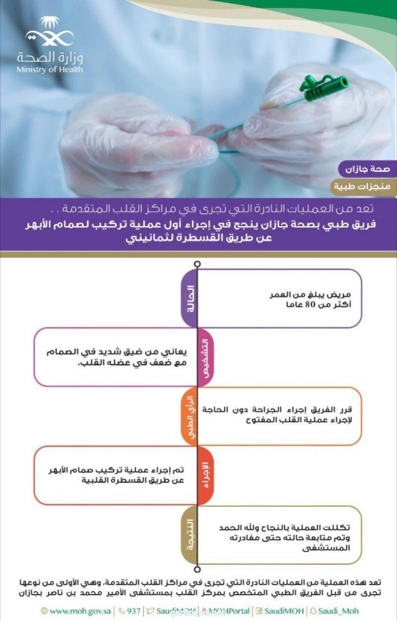 جدير بالذكر أن هذه العملية من العمليات التي تُجرى في مراكز القلب المتقدمة؛ حيث تعد الأولى من نوعها التي أجراها الفريق الطبي المتخصص بمركز القلب بمستشفى الأمير محمد بن ناصر في جازان.