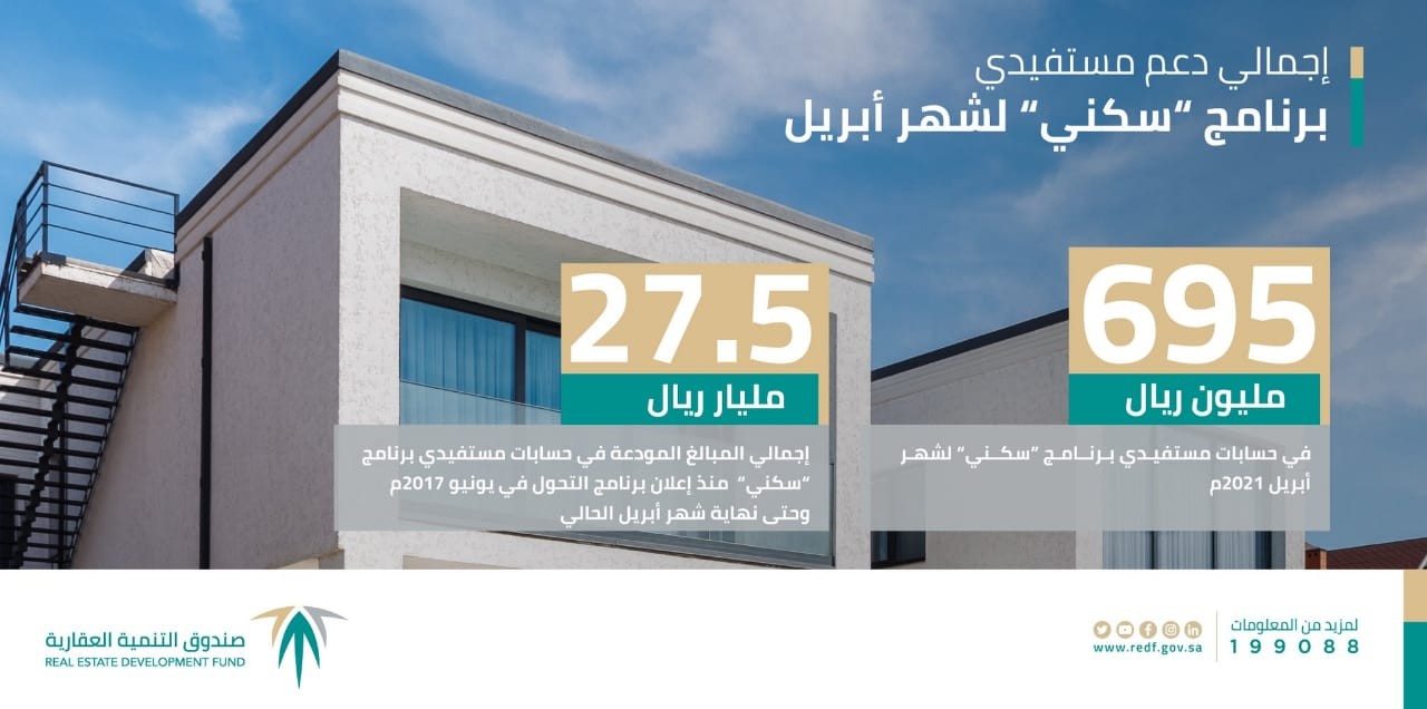 أعلن صندوق التنمية العقارية، اليوم، عن إيداعه أكثر من 695 مليون ريال في حسابات المواطنين من مستفيدي برنامج "سكني" وصندوق التنمية العقارية لشهر أبريل الجاري 2021، مؤكداً استمرار الدعم السكني لتمكين الأسر السعودية من تملك المساكن بهدف زيادة نسبة التملك إلى 70% بحلول 2030، وفق مستهدفات برنامج الإسكان أحد برامج رؤية المملكة 2030.