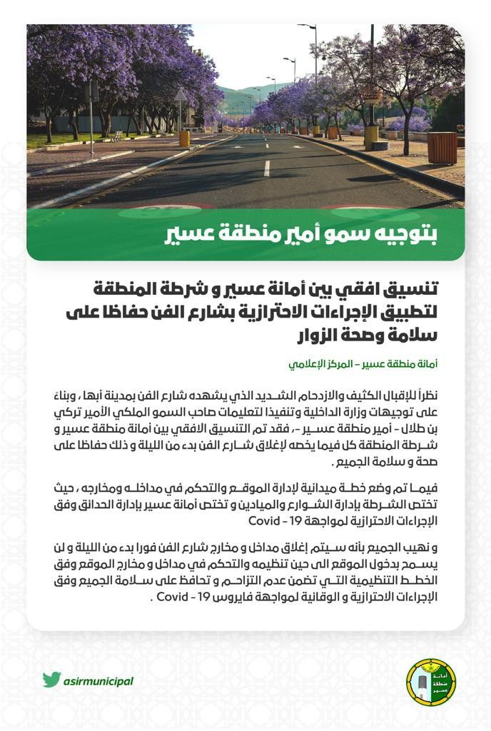 نظراً للإقبال الكثيف والازدحام الشديد الذي يشهده شارع الفن بمدينة أبها ، وبناءً على توجيهات وزارة الداخلية وتنفيذا لتعليمات صاحب السمو الملكي الأمير تركي بن طلال - أمير منطقة عسير -، فقد تم التنسيق الافقي بين أمانة منطقة عسير و شرطة المنطقة كل فيما يخصه لإغلاق شارع الفن بدء من الليلة و ذلك حفاظا على صحة و سلامة الجميع .