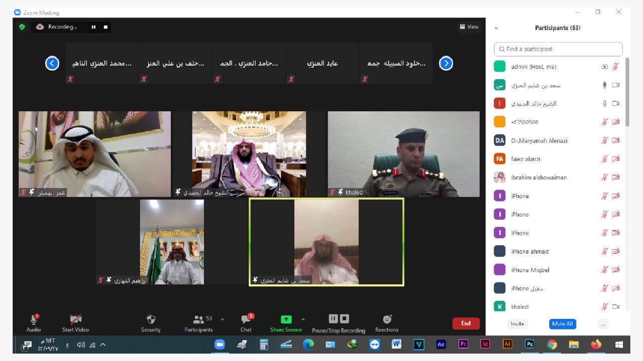 برعاية كريمة من لدن صاحب السمو الملكي الامير فيصل بن خالد بن سلطان بن عبدالعزيز امير منطقة الحدود الشمالية اقام فرع وزارة الموارد البشرية والتنمية الاجتماعية بمنطقة الحدود الشمالية أمسية رمضانية افتراضية بعنوان الجهود الوطنية لحماية الوطن وابناءه أمنيا وفكريا بمشاركة الشيخ خالد الجنيدي رئيس المحكمة العامة والشيخ سعد شايم العنزي والعقيد خالد الشملاني والرائد ابراهيم النهاري .