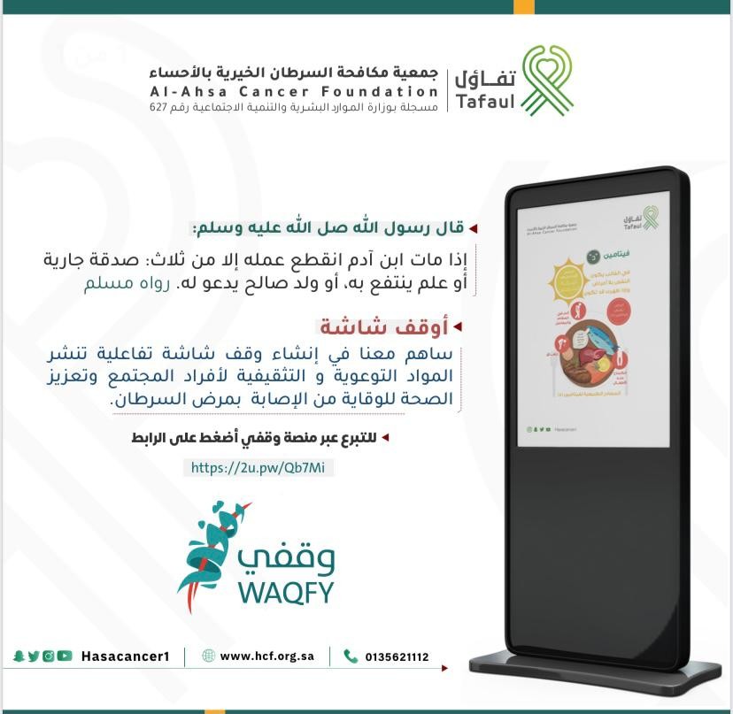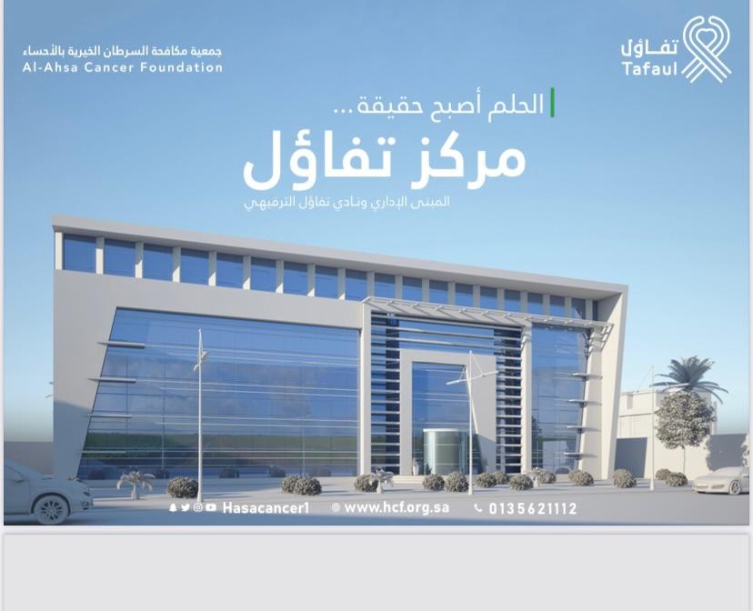 دعت جمعية مكافحة السرطان في الأحساء "تفاؤل"، وفي ختام شهر رمضان المبارك جميع أفراد المجتمع ورجال الأعمال والشركات الكبرى والمؤسسات إلي دعم مشاريع الجمعية الوقفية التالية: