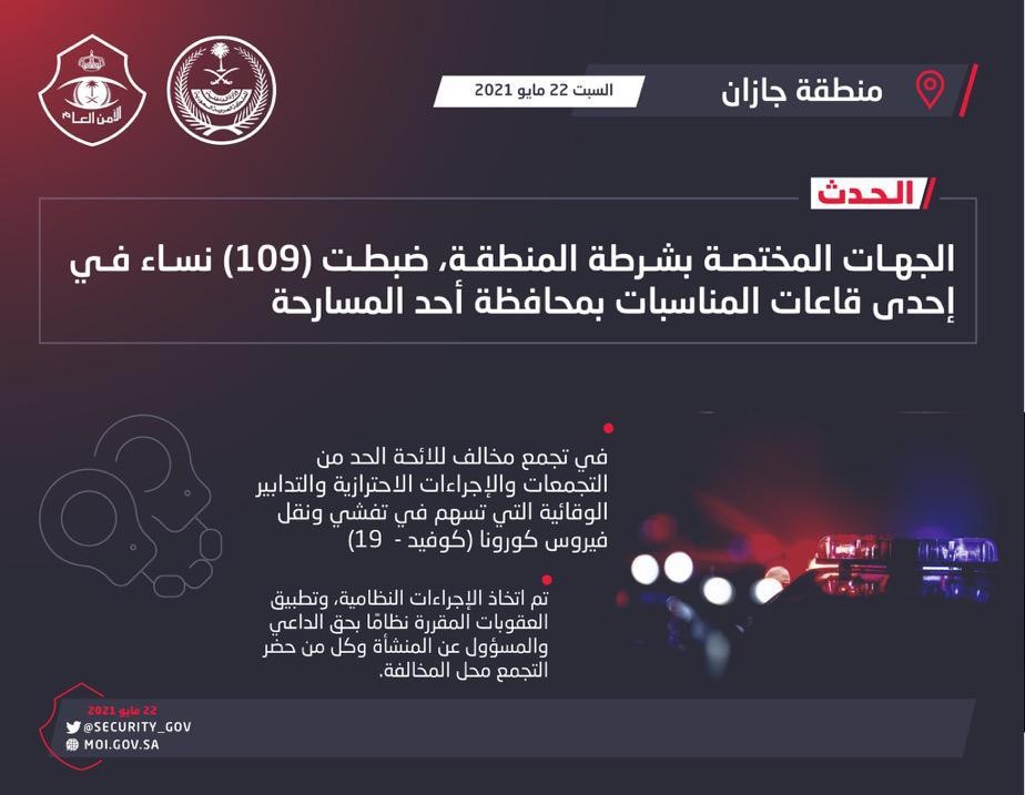 صَرّح المتحدث الإعلامي لشرطة منطقة جازان الرائد نايف حكمي، بأن الجهات المختصة بشرطة المنطقة، ضبطت (109) من النساء في إحدى قاعات المناسبات بمحافظة أحد المسارحة، في تجمع مخالف للائحة الحد من التجمعات والإجراءات الاحترازية والتدابير الوقائية التي تسهم في تفشي ونقل فيروس كورونا ، وتم اتخاذ الإجراءات النظامية، وتطبيق العقوبات المقررة نظامًا بحق الداعي والمسؤول عن المنشأة وكل من حضر التجمع محل المخالفة.