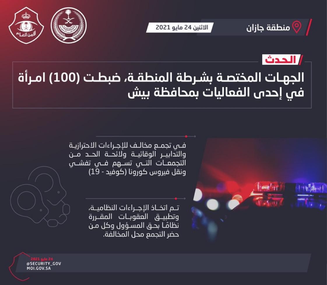 صَرّح المتحدث الإعلامي لشرطة منطقة جازان الرائد نايف حكمي، بأن الجهات المختصة بشرطة المنطقة ضبطت (100) امرأة في إحدى الفعاليات بمحافظة بيش ، في تجمع مخالف للإجراءات الاحترازية، والتدابير الوقائية ولائحة الحد من التجمعات التي تسهم في تفشي ونقل فيروس كورونا (كوفيد - 19)، وجرى اتخاذ الإجراءات النظامية، وتطبيق العقوبات المقررة نظامًا بحق المسؤول وكل من حضر التجمع.