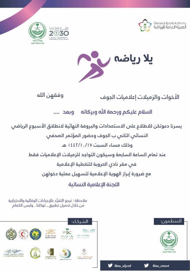 النسائي الثاني  تحت شعار " يلّا رياضه " التي ستقام على منشاة نادي العروبة للرياضة بالجوف خلال الفترة من 19 إلى 22 شوال الجاري ، وذلك بالتعاون مع الهيئة العامة للرياضة وبإشراف ومتابعة مكتب وزارة الرياضة بالجوف ، مؤتمراً صحفياً مساء يوم السبت المقبل 17/ 10. في قاعة المؤتمرات بنادي العروبة في تمام الساعة السابعة مساءً