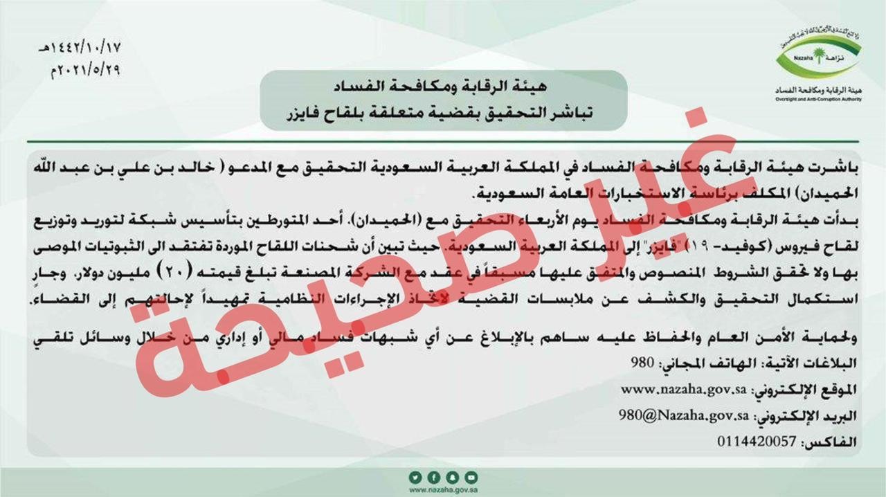 «نزاهة»: لا صحة للقصاصة المتدولة والمتضمنة التحقيق مع شخص بقضية توريد لقاح فايزر