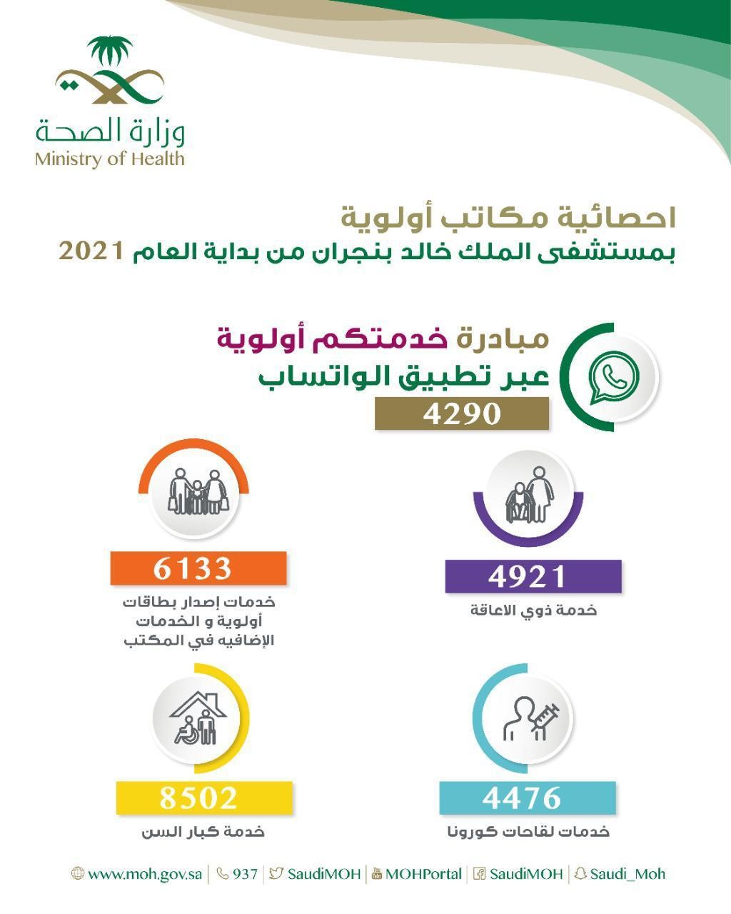 وبينت صحة نجران أن مكاتب أولوية بمستشفى الملك خالد أطلقت مبادرة عبر تطبيق الواتساب تحت عنوان (خدمتكم أولوية) استفاد منها 4290 شخص، ضمن توجيهات وزارة الصحة للاهتمام بالمرضى وتقديم كافة الخدمات والتسهيلات لتحقيق أعلى مستويات الرضا للمرضى وذويهم.