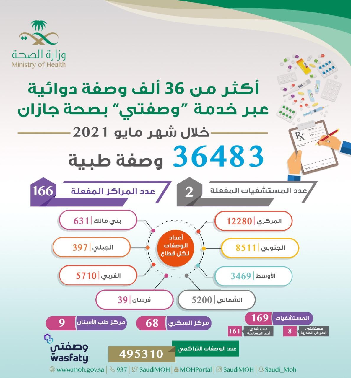 صرف أكثر من 36 ألف وصفة طبية عبر خدمة ” وصفتي ” بصحة جازان خلال شهر مايو الماضي