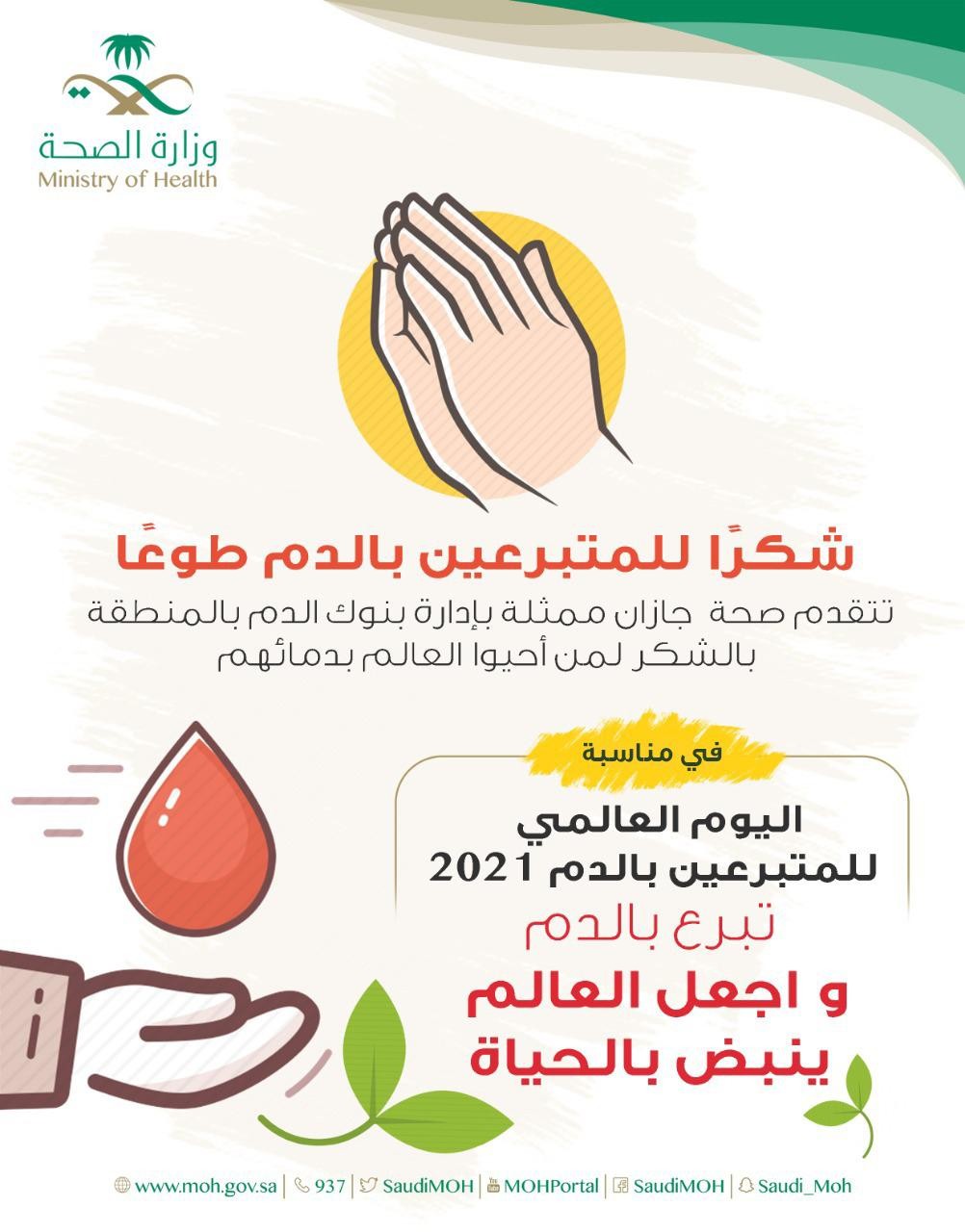 أطلقت صحة جازان حملة للتبرع بالدم في جميع المستشفيات التابعة لها وعربات التبرع بالدم المنتشرة في أماكن التجمعات تحت شعار تبرع بالدم واجعل العالم ينبض بالحياة تزامناً مع اليوم العالمي للتبرع بالدم 2021، .