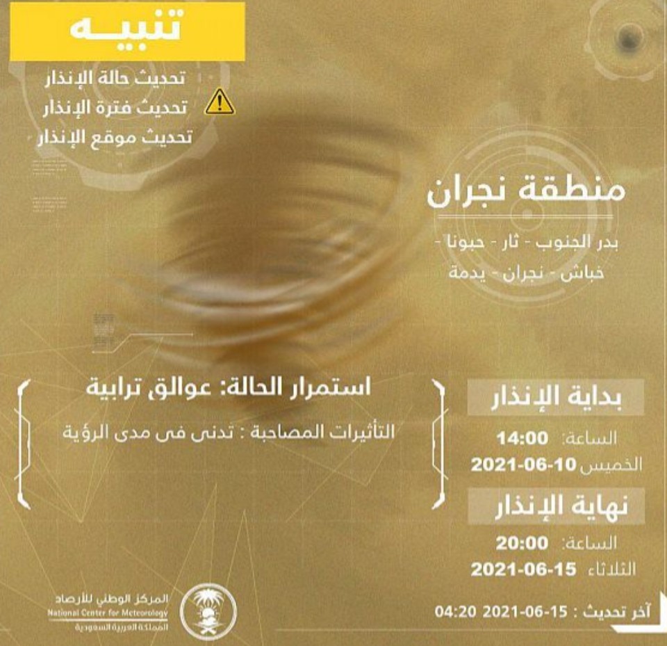 نبّه المركز الوطني للأرصاد اليوم، من عوالق ترابية تؤدي إلى تدني مدى الرؤية على منطقة نجران، تشمل مدينة نجران، ومحافظات حبونا، وثار، وخباش، وبدرالجنوب، ويدمة.